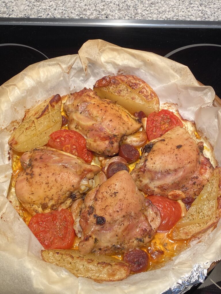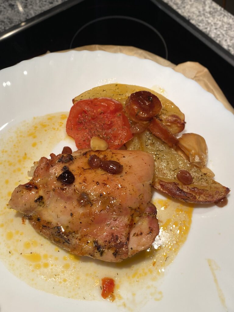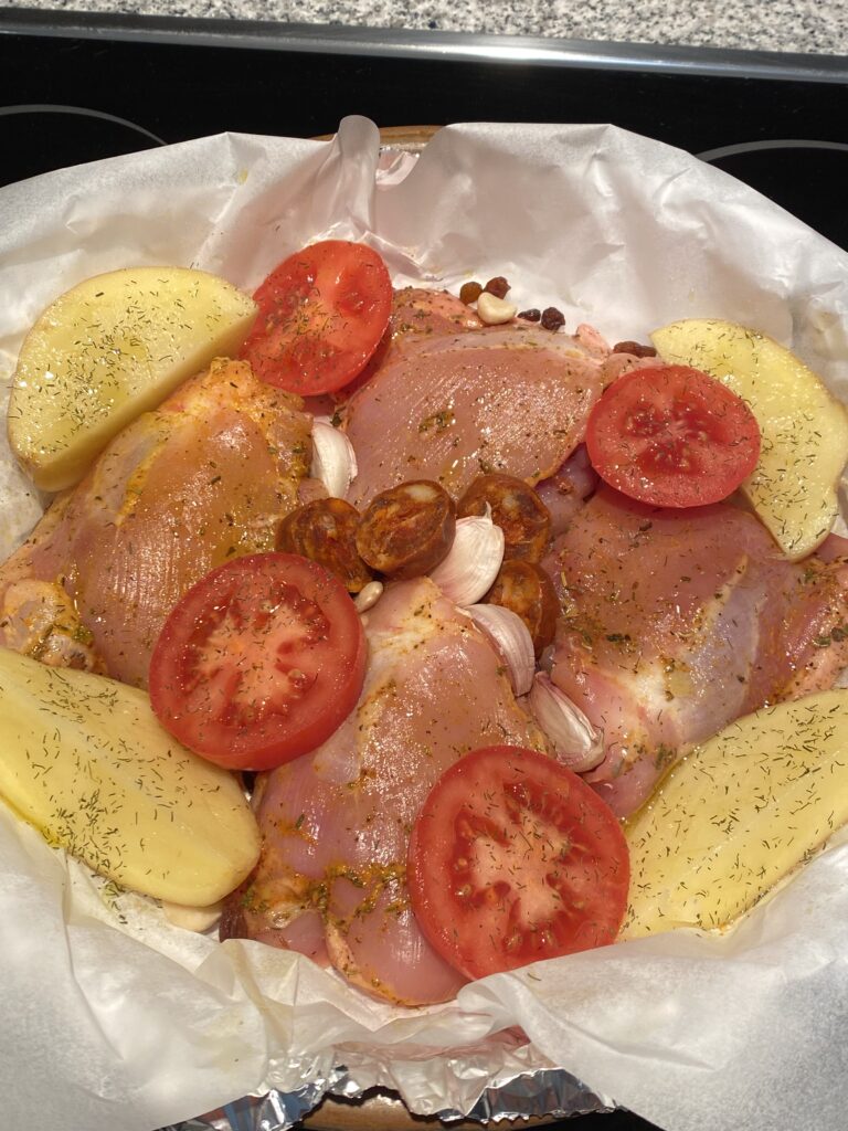 Сегодня я готовила куриные окорочка. Рассказываю рецепт, который очень прост — окружаем курицу чем бог послал. Вот нам он сегодня послал то, что нашла в холодильнике: