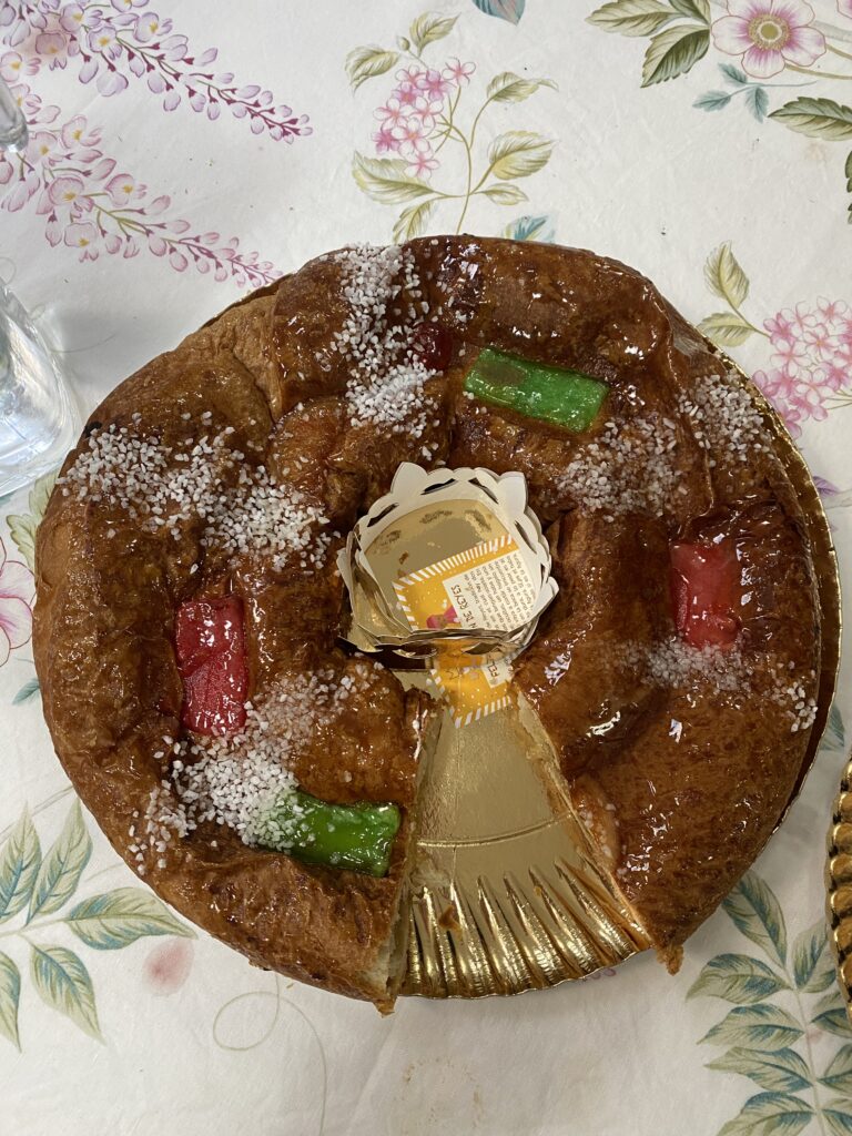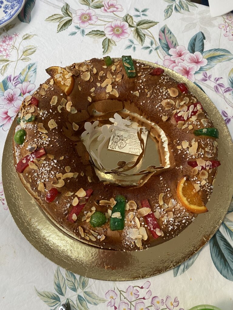 Потом щедрый стол. В Валенсии это picoteo — лёгкие закуски (фьямбре: хамон, чорисо; сыры, тарталетки и другие пикотео), за ними паэлья или барашек, овощной салат (да! всего один 😁), десерт (как правило, апельсины и мандарины) и кофе-чай со множеством сладостей. Кроме стопок различных турронов и конфет, в день Волхвов обязательно едят roscón de reyes (роскон) — такой пирог в форме кольца. В центр помещается корона, которая в этот раз досталась мне!